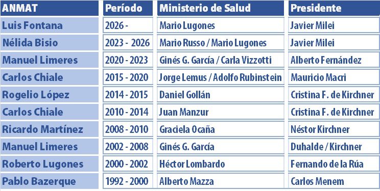 Y antes de Chiale estuvo al mando del organismo Rogelio López, también durante la presidencia de Cristina Kirchner. Otro funcionario que se sentó en el sillón principal de la ANMAT fue Ricardo Martínez, durante el gobierno de Néstor Kirchner, también Roberto Lugones en la presidencia de Fernando de la Rúa, y el primero fue Pablo Bazerque, durante el gobierno de Carlos Menem.