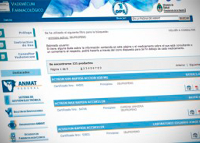El mismo está contenido dentro de la página web de la Administración Nacional de Medicamentos y Tecnología y permite realizar las búsquedas por principio activo, marca y otros campos como por laboratorio y número de certificado.
