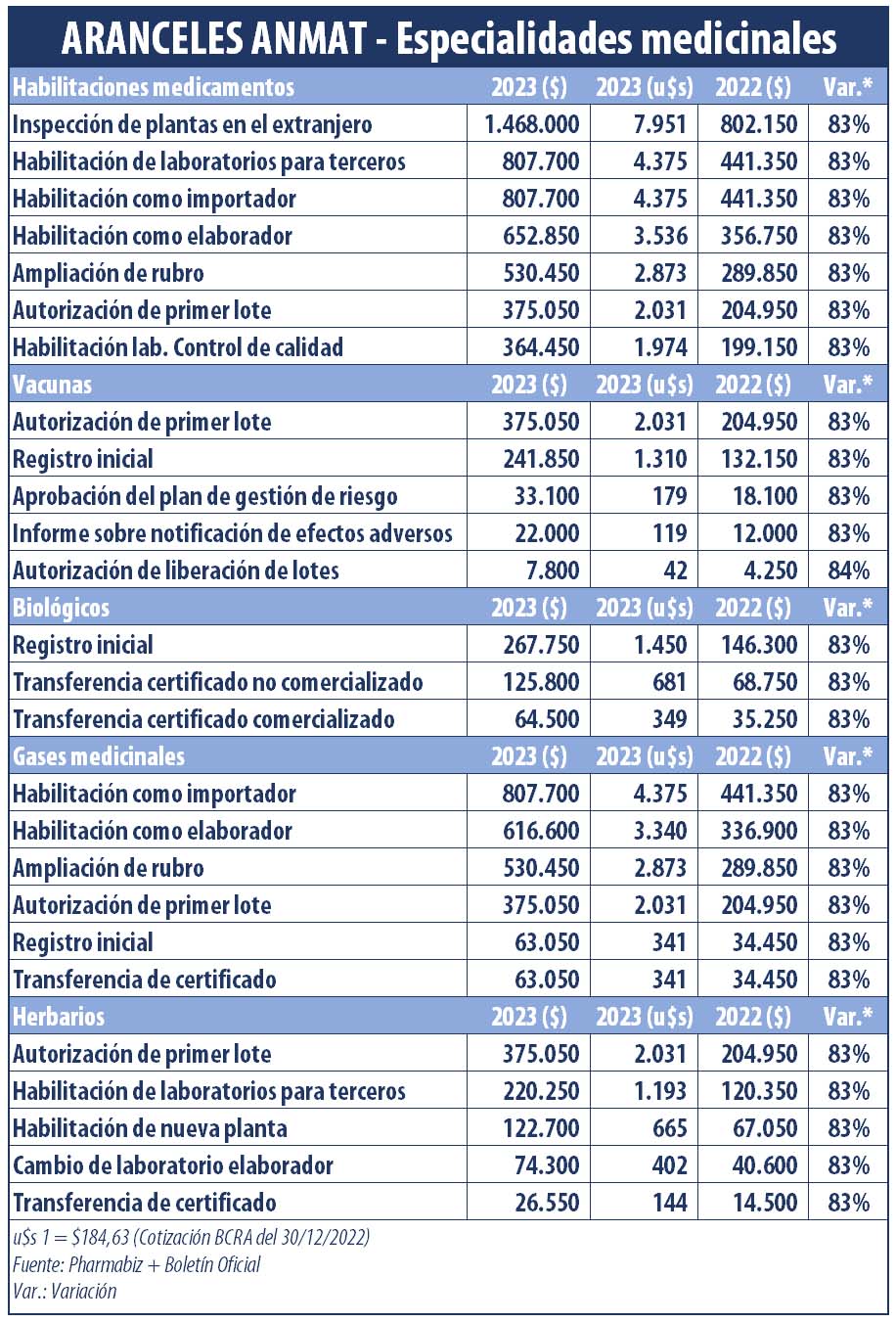 Los productos biológicos también tendrán su pertinente actualización. En este 2023, el arancel para el trámite del registro inicial de un medicamento dentro de esta categoría significará una suma de $267.750 (u$s 1.450) frente a los $146.300 (u$s 1.291*) que implicaba en el 2022.