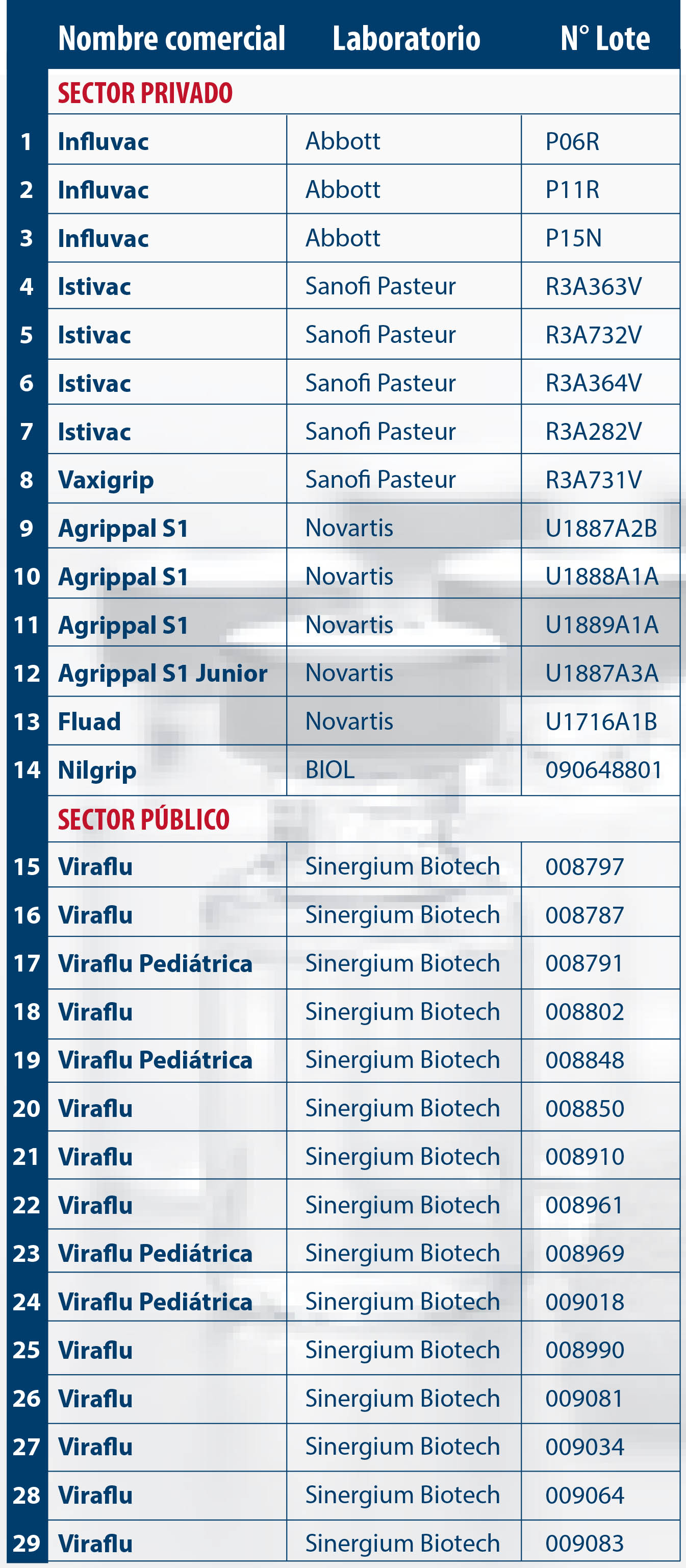 Al momento son 36 los lotes disponibles. De esa cifra, 22 son para el sector público y 14 para comercializar en el canal minorista. Las compañías que tienen lotes en el marcado son Sanofi Pasteur; Novartis; Abbott; BIOL; y Sinergium Biotech.