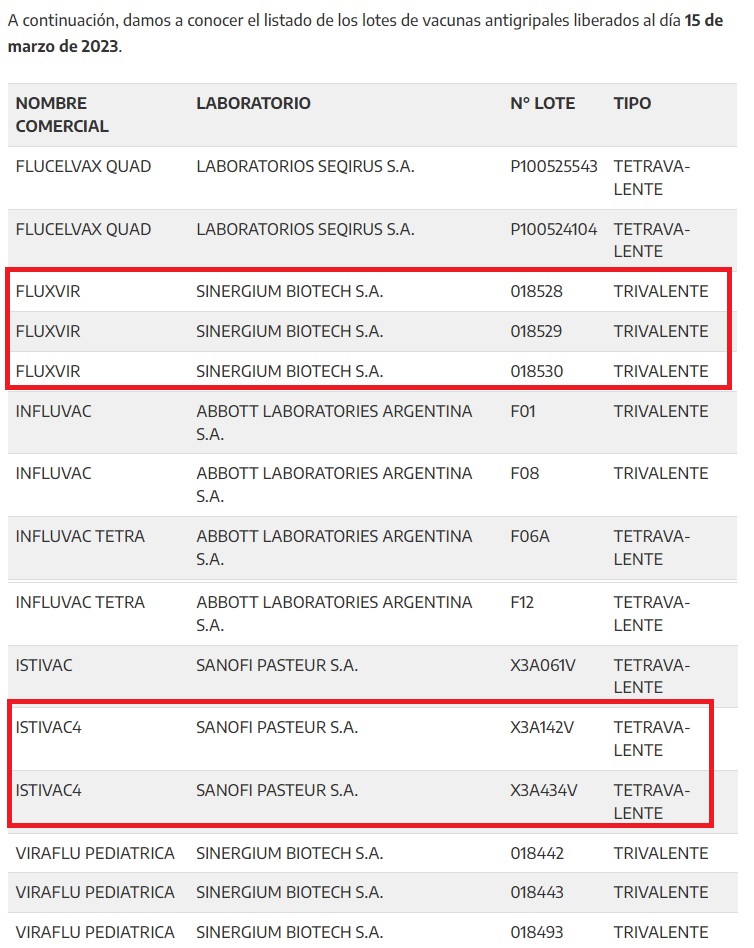 De ese conjunto, hay ocho para el sector público: seis lotes del consorcio Sinergium Biotech y dos de la norteamericana Abbott, todas trivalentes. En tanto hay disponibles siete para el canal privado. En este caso, dos tienen el sello de la australiana Seqirus; tres, de la francesa Sanofi; y dos, de la norteamericana Abbott.