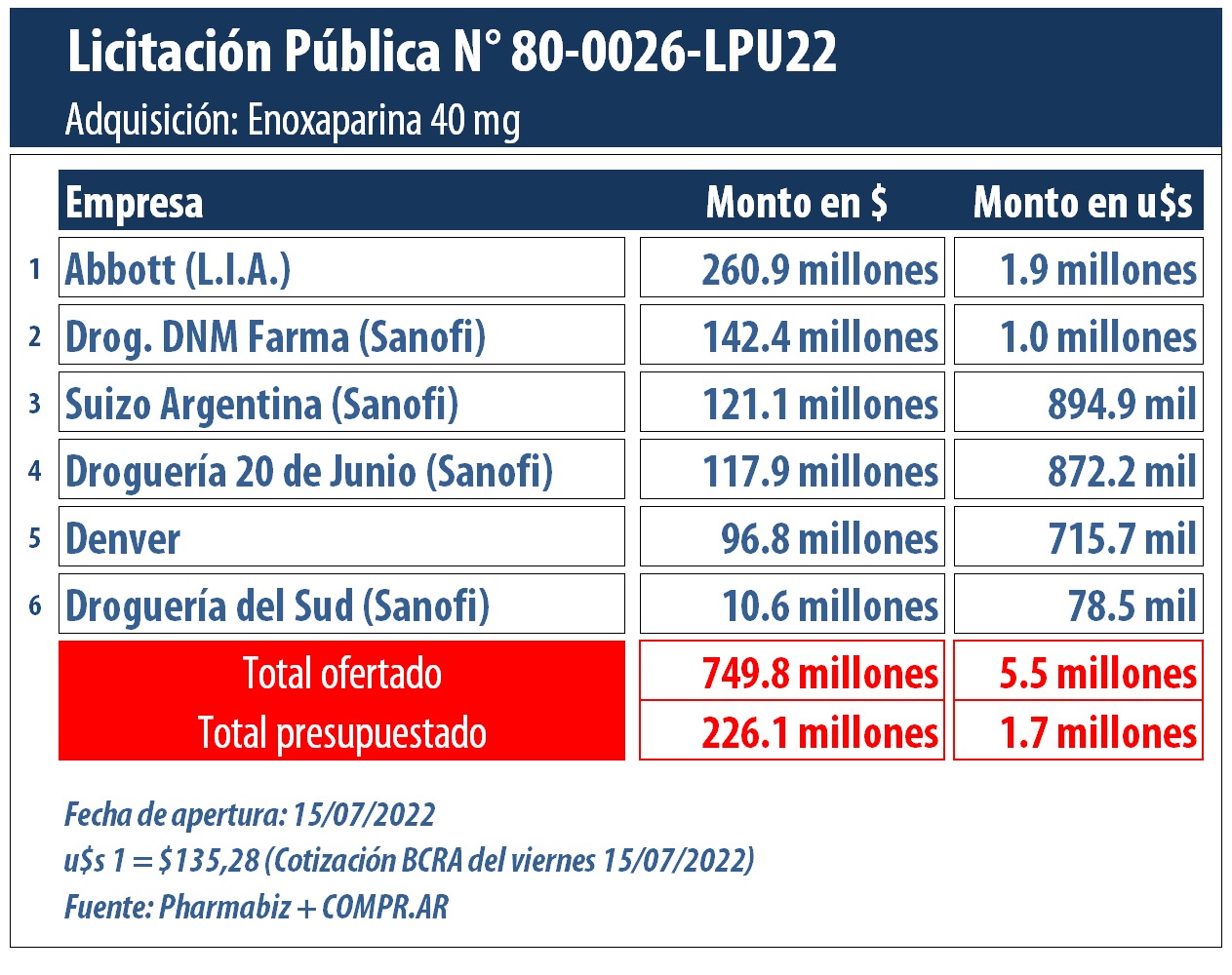 En la otra punta, la estadounidense Abbott ofertó el precio más alto. La multi figura con una suma de $260.9 millones (u$s 1.9 millones) equivalente a su etiqueta Enoxanorth; y un precio unitario de $1.590 (u$s 11,75). Ver Cuadro Comparativo.