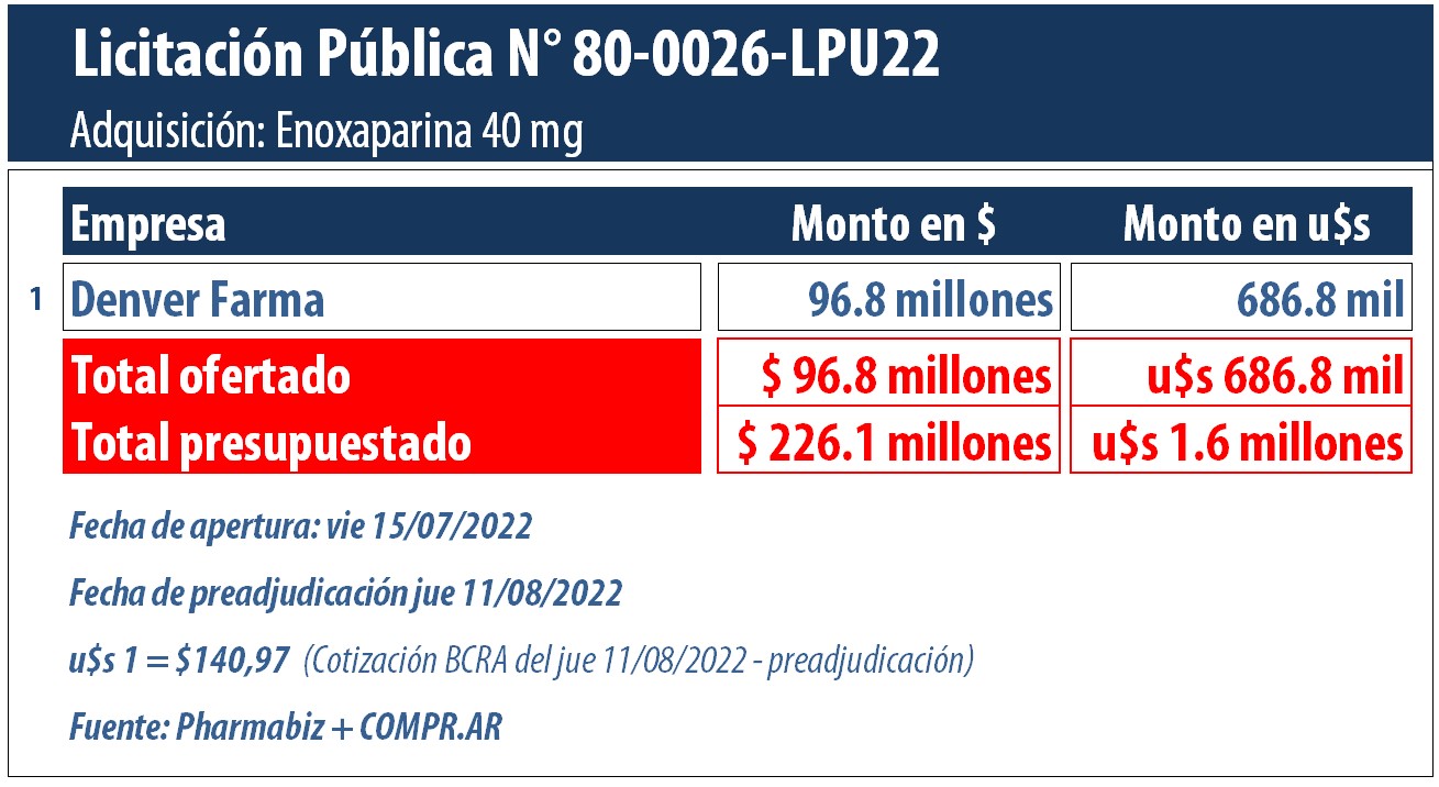 Si bien en primera instancia seis empresas presentaron sus ofertas, la Comisión Evaluadora de la Unidad Operativa de Contrataciones recomendó únicamente la cotización del laboratorio nacional Denver Farma que se anotó con su producto Heparinox por $96.8 millones (u$s 686.8 mil). Dicha cifra significa un -57,18% más bajo que el monto que el Estado había presupuestado en primera instancia y que alcanzaba los $226.1 millones (u$s 1.6 millones). En julio, la firma propiedad de las familias Tombazzi y Rossi había presentado el precio unitario más conveniente de $590 (u$s 4,18) a fin de cubrir la entrega de un total de 164.1 mil jeringas prellenadas de su producto.
