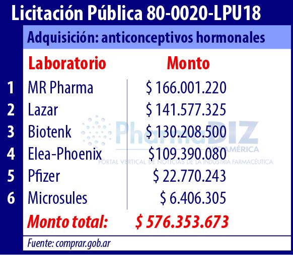 La Secretaría de Salud de la Nación abrió una licitación pública a fin de adquirir anticonceptivos hormonales. Se postularon seis empresas, entre las que figuran la de genéricos Biotenk; y el tercerista MR Pharma. Las únicas compañías de peso fueron la nacional Elea-Phoenix y la multi Pfizer.