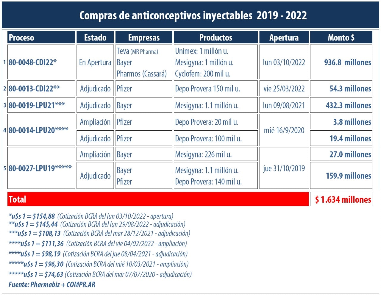 En simultáneo, la alemana Bayer se anotó con su anticonceptivo inyectable Mesigyna por $720 millones (u$s 4.6 millones) y un precio unitario de $719,98 (u$s 4,64).