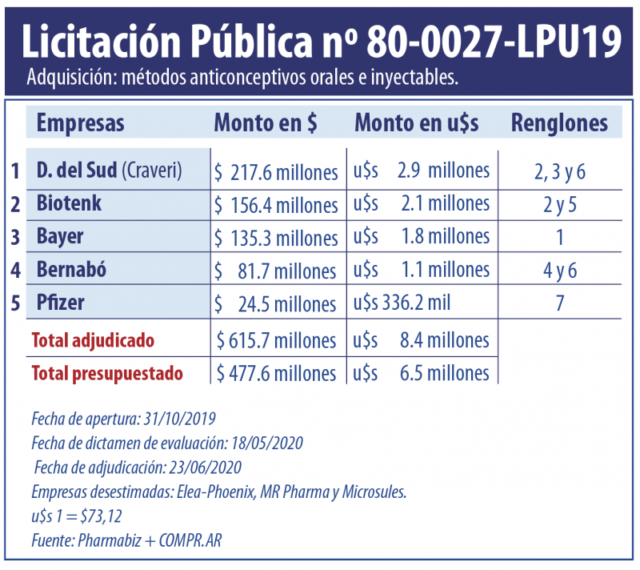 Otro laboratorio que resultó ganador fue el nacional Bernabó, que participó con sus anticonceptivos orales Cuidafem y Camelia por $81.7 millones (u$s 1.1 millones). Y, por último, quedó la norteamericana Pfizer que gracias a su inyectable Depo Provera, resultó adjudicataria por un total de $24.5 millones (u$s 336.2 mil).