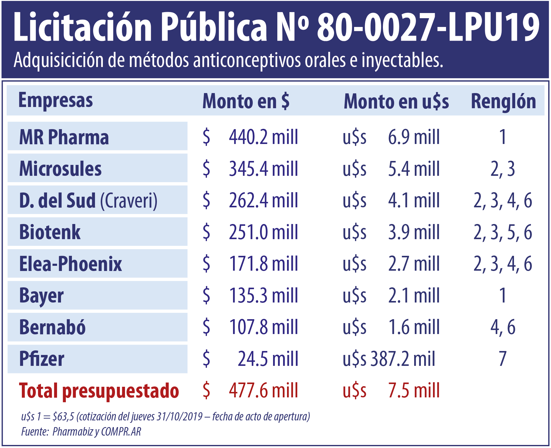 Las multinacionales también levantaron la mano para esta licitación. Por un lado, la alemana Bayer lo hizo para un sólo renglón y con su marca Mesigyna por un total de $135.3 millones (u$s 2.1 millones). Mientras que la norteamericana Pfizer hizo lo propio con su inyectable Depo Provera y por el que podría percibir ingresos por $24.5 millones (u$s 387.2 mil).