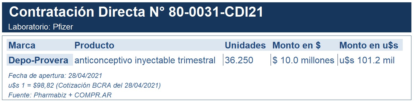 Además de adquirir anticonceptivos orales combinados de los nacionales Elea y Biotenk; un inyectable de Pfizer; y el DIU Mirena, de la alemana Bayer, el Ministerio de Salud activó hoy una contratación directa por exclusividad para hacerse de 150 mil ampollas del anticonceptivo inyectable trimestral Depo-Provera, un producto de la norteamericana Pfizer. Ver artículo marzo Ver artículo Bayer