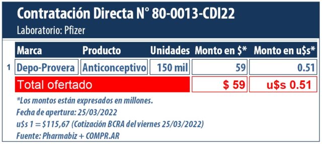 La norteamericana Pfizer está en carrera para proveerle al Estado de 150 mil unidades del producto Depo-Provera, en el marco de una Contratación Directa por Exclusividad. Se trata de un anticonceptivo inyectable de aplicación trimestral.