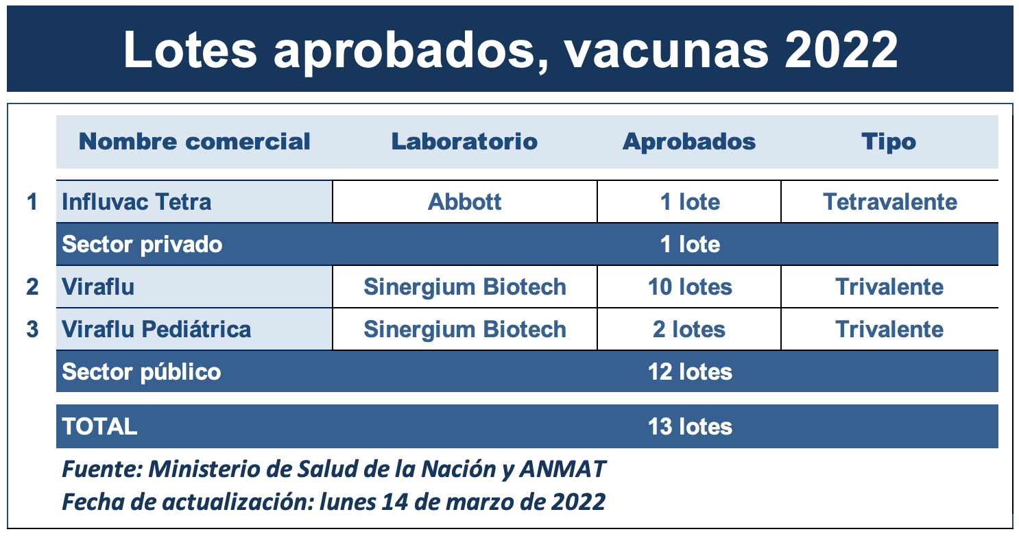 Para el sector público, en tanto, Sinergium Biotech recibió la autorización de 12 lotes a la fecha. Todos corresponden a su vacuna trivalente Viraflu, y dos de ellos a la versión pediátrica. Ver artículo Vacunas antigripales 2022.