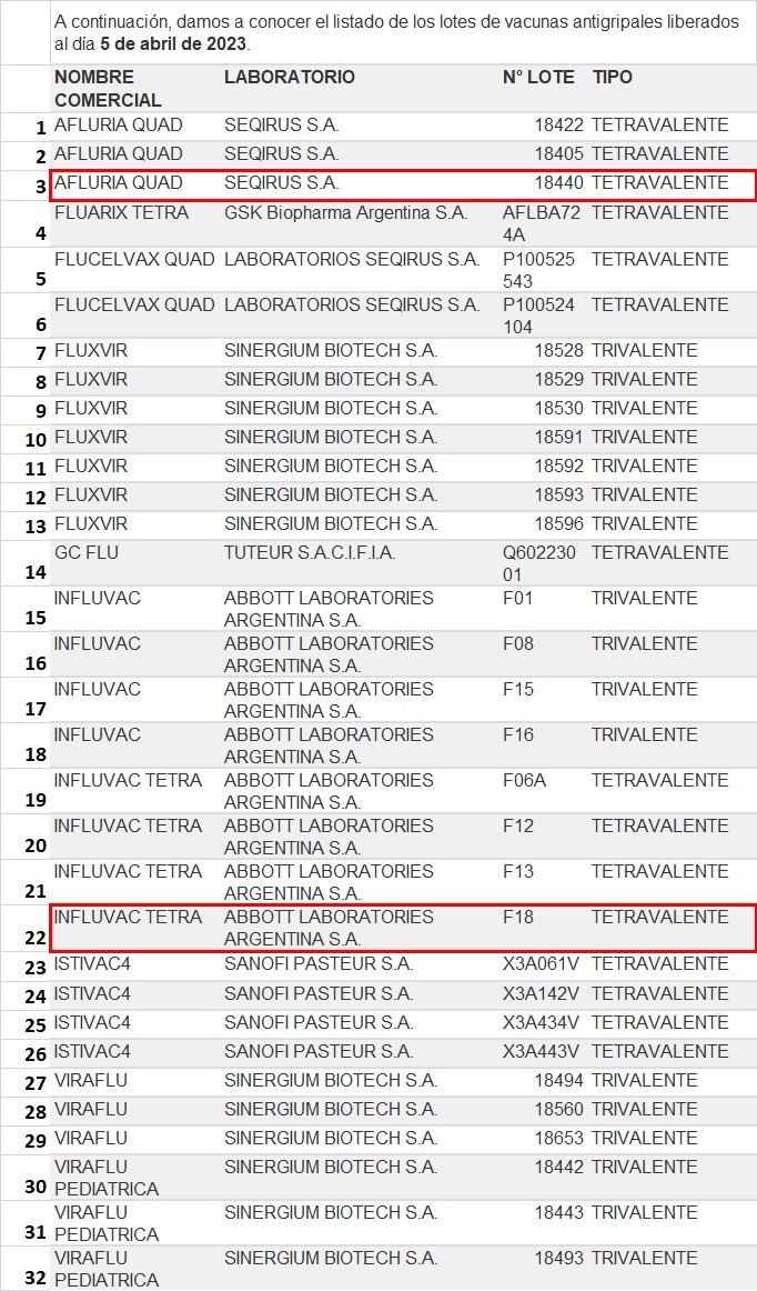 En tanto, para el canal conformado por farmacias y vacunatorios, fueron liberados 15 lotes de tetravalentes. En este apartado se listan cinco de la australiana Seqirus; cuatro de la francesa Sanofi; cuatro de la norteamericana Abbott; una del nacional Tuteur; y una de la británica GSK.