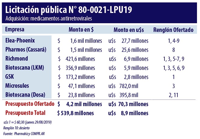 En abril de este año, el Estado había dado a conocer a los seis ganadores para otra licitación de antirretrovirales. Luego, durante este 2019 la Secretaría de Salud comandada por Adolfo Rubinstein materializó compras pero a través de contrataciones directas por exclusividad con empresas como GSK y Richmond. Ver artículo Ver artículo.