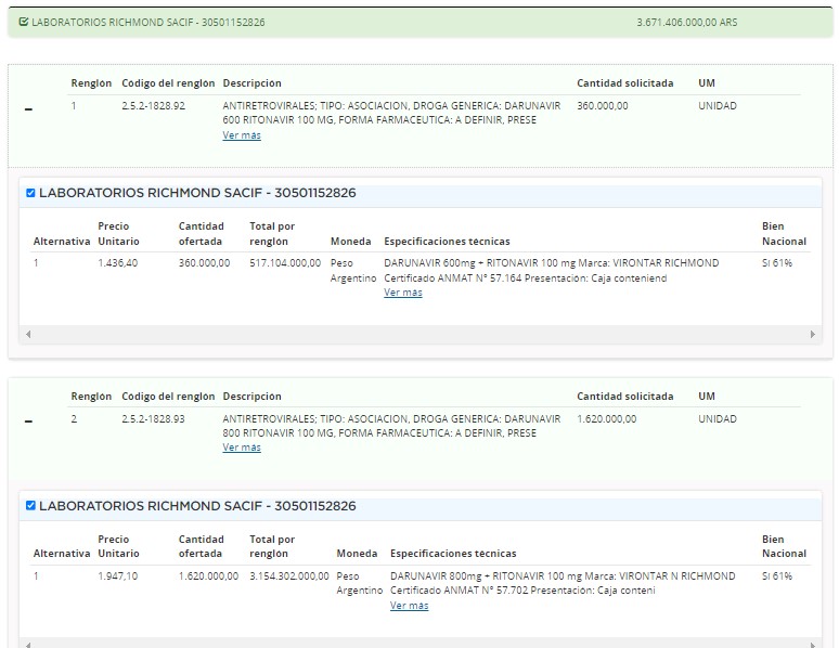 Mediante este proceso, el Estado busca adquirir 6 mil cajas de 60 unidades de Virontar –360 mil comprimidos que combinan darunavir 600 mg. con ritonavir 100 mg-; así como de 54 mil cajas de 30 comprimidos de Virontar N, que combinan darunavir 800 mg. y ritonavir 100 mg. El laboratorio Richmond hizo una oferta por $3.671 millones (u$s 9.9 millones) para cubrir la demanda completa. Ver Cuadro Comparativo