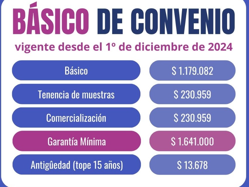 Con este nuevo entendimiento, un visitador médico tiene fijado un ingreso mensual mínimo de $1.641.000 (u$s 1.555,35) en diciembre. Esta cifra está conformada por un básico de $1.179.023 (u$s 1.117,49); un adicional de $230.959 (u$s 218,90) por tenencia de muestras; y otro monto equivalente en concepto de comercialización. A esto también se le combina un total de $13.698 (u$s 12,98) por cada año de antigüedad, con un tope de 15 años. Ver acuerdo octubre / Ver acuerdo de julio