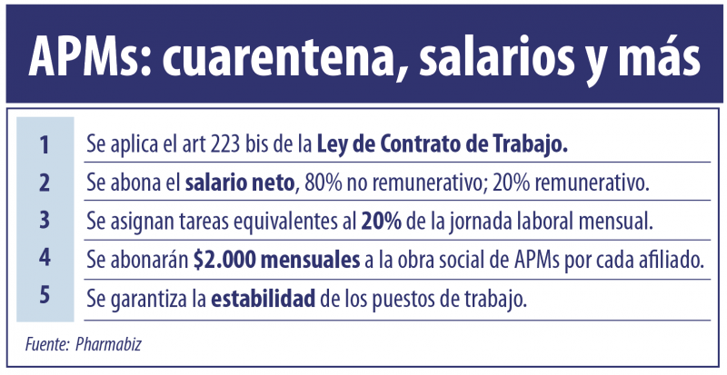 En el acta que tiene fecha del lunes 27 de abril, las cámaras y la FAAPROME consensuaron además una contribución patronal de emergencia a través de la cual los laboratorios abonarán $2.000 mensuales a la obra social de los APMs en concepto de cada trabajador afiliado. A su vez se garantizó la estabilidad de los puestos de trabajo hasta el 31 de mayo, siguiendo lo establecido en los artículos 2 y 3 del DNU 329.