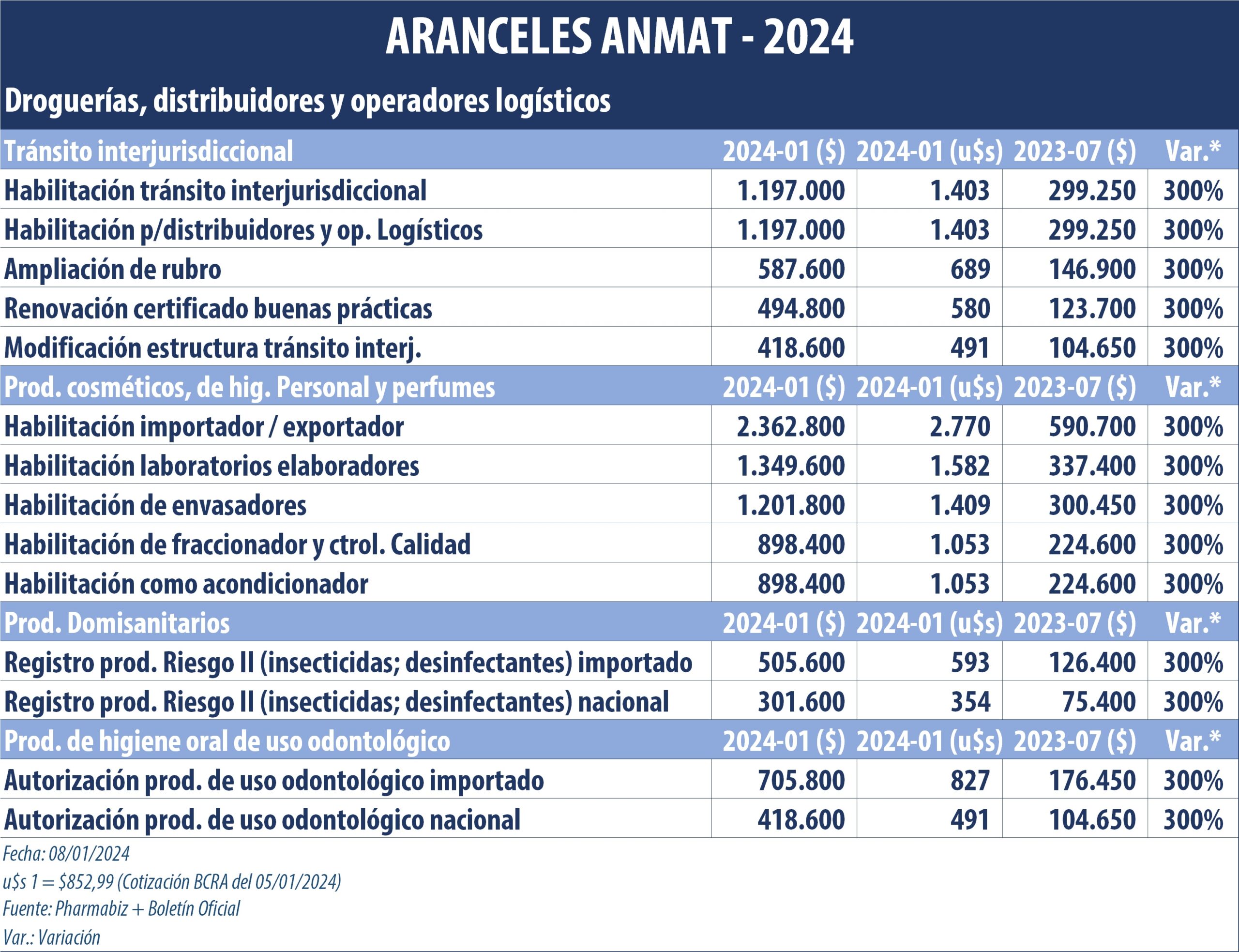 En este inicio del 2024 las droguerías tendrán que desembolsar, por caso, $1.197.000 (u$s 1.403) -frente a los $299.250 (u$s 1.102*) de julio 2023- para tramitar la habilitación para el tránsito interjurisdiccional de especialidades medicinales. Es el mismo monto que deberán abonar quienes tengan que habilitarse como distribuidores y operadores logísticos de medicamentos.