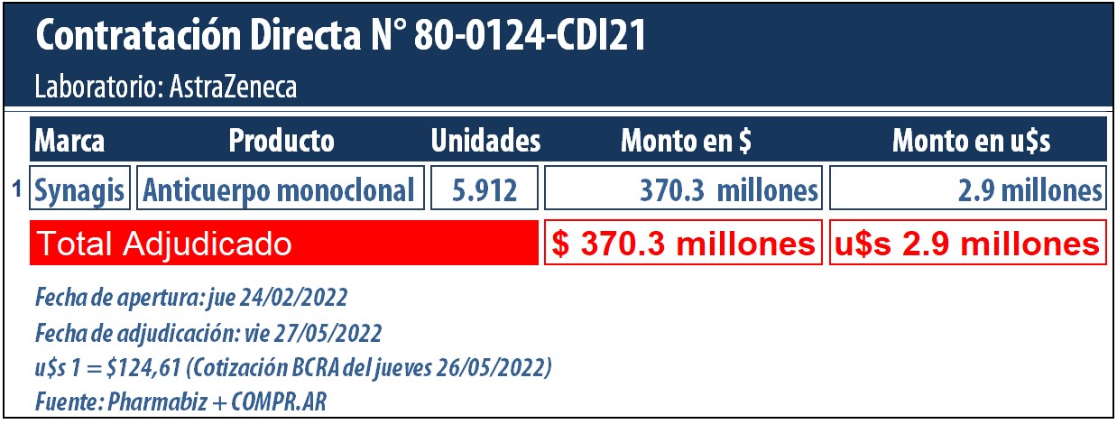 Tres meses después de haber puesto en marcha una Contratación Directa por Exclusividad a fin de adquirir partidas de Synagis a la británica AstraZeneca, el Ministerio de Salud de la Nación adjudicó la compra. Ver Adjudicación