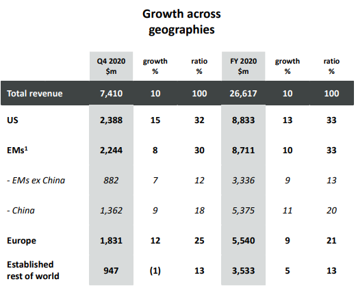 Los que AZ clasifica como Mercados Emergentes aportaron otro 33% de la facturación con un incremento en moneda constante del 10% a u$s 8.711,3 millones. De ese monto, u$s 5.375 millones provinieron de China, que creció 11% YoY.