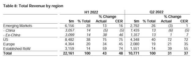 Al poner la lupa sobre cada región, los Mercados Emergentes le implicaron el 28% de la facturación total, con un avance del 16% a u$s 6.156 millones. De estos, u$s 3.057 millones fueron originados en China, que tuvo un retroceso de -5% en su comparación interanual.