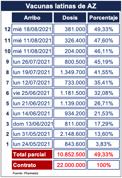 Al cabo de nueve meses se recepcionaron al momento un total de 10.8 millones de unidades de la versión latina de la vacuna anti COVID-19 de AZ. Dicha cifra, y de acuerdo al seguimiento propio realizado por Pharmabiz, representa el 49,33% del contrato sellado con la farmacéutica en noviembre pasado y que prometía 22 millones de vacunas. Ver artículo «AZ firmó su acuerdo por vacuna, Argentina».