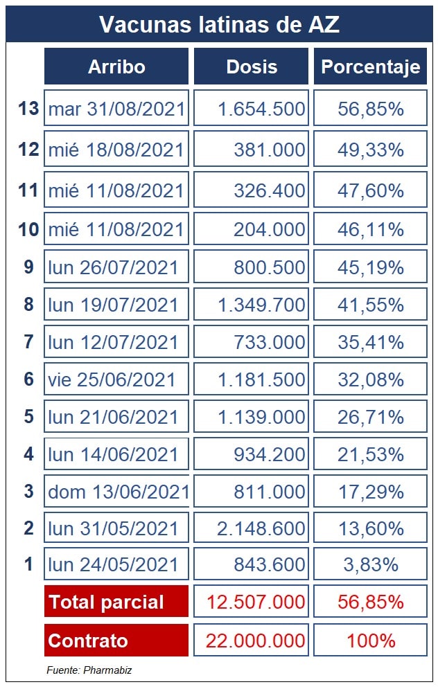 Este es el envío más voluminoso recibido desde mayo, en el marco del acuerdo sellado con el laboratorio británico en noviembre pasado por 22 millones de vacunas. A la fecha y al cabo de casi diez meses, se contabilizó un total de 12.5 millones de unidades de la versión latina de la vacuna anti COVID-19 de AZ. Dicha cifra, según el monitoreo realizado por Pharmabiz, representa el 56,85% del convenio suscripto.