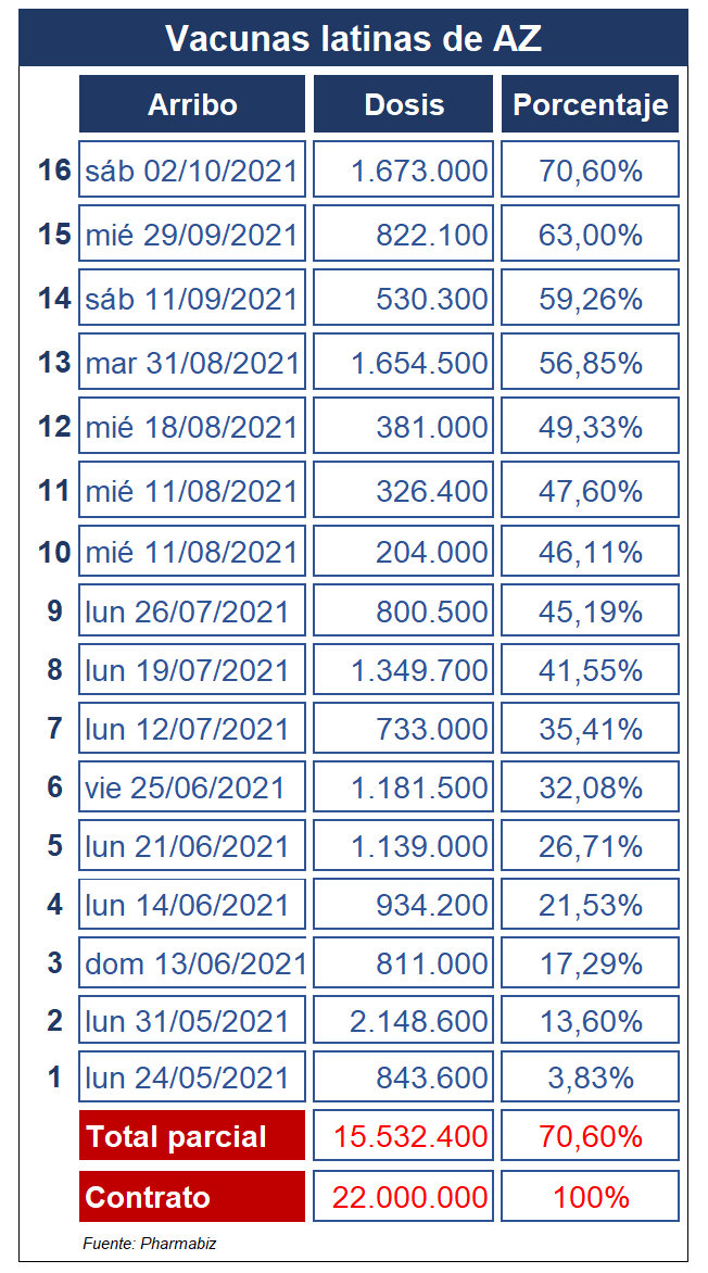 Se trató de un lote integrado por 1.6 millones de unidades, el que fue enviado desde la Ciudad de México, mediante el vuelo AM30 de la aerolínea de bandera. El mismo forma parte del acuerdo bilateral suscripto en noviembre pasado, y a través del cual se había acordado que el país recibiría 22 millones de dosis. Sin embargo, de acuerdo al relevo realizado por Pharmabiz, al momento se recepcionaron 15 millones de dosis, lo que representa el 70,6% de lo estipulado. Ver Comunicado.
