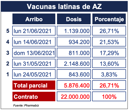 A pesar de que ya hubo dos envíos en mayo y el de hoy es el tercero de junio, la Argentina recibió recién el 26,7% de todo lo pautado, lo que tiene como norte 22 millones de dosis.