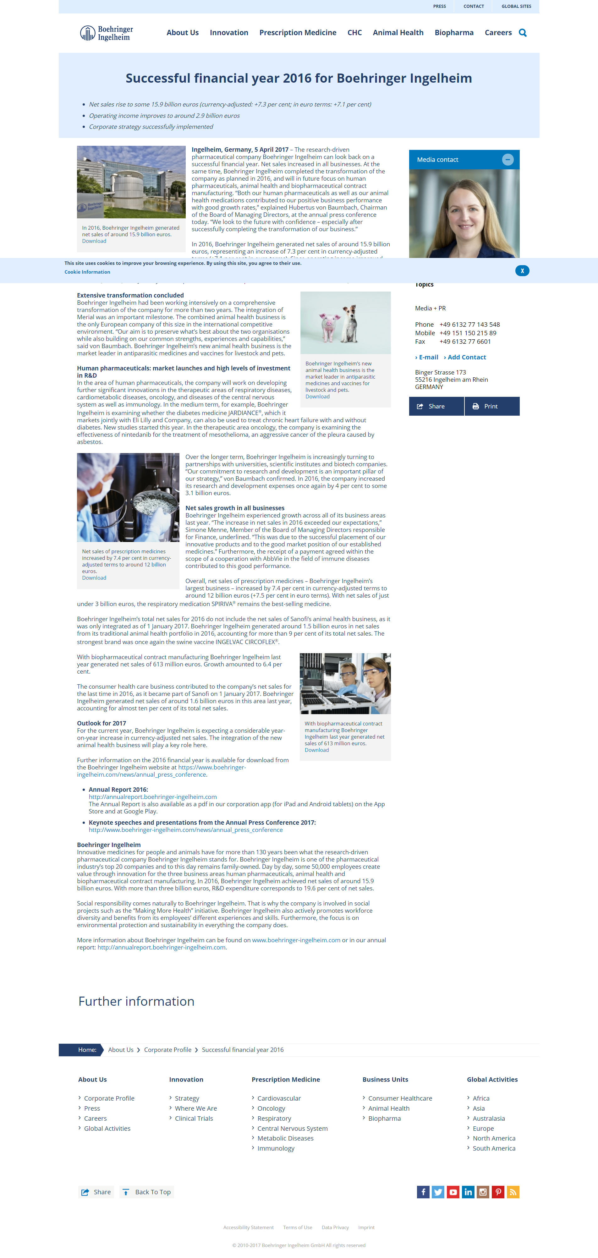 En cuanto a los resultados del 2016, B.I. reportó un crecimiento en ventas del 7.3%, que se vio expresado en ingresos por €15,9 mil millones. La unidad de Prescription fue la segunda en facturación, luego de Salud Animal, con una suba del 7.4% impulsada por su producto de respiratoria, Spiriva. Ver press release