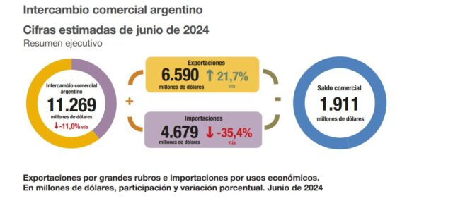 Por sexto mes consecutivo, la balanza de intercambio internacional presentó un saldo favorable. Según el último informe publicado por el INDEC este jueves, en junio, las exportaciones aumentaron 21,7% en comparación con el mismo mes del año anterior a u$s 6.590 millones. Ver informe