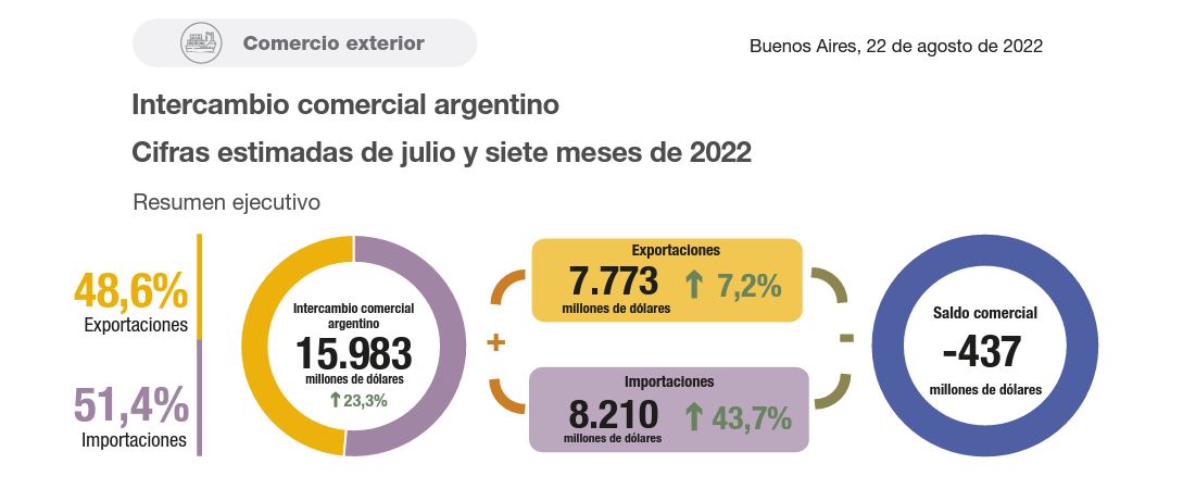 Durante el mes de julio, el intercambio comercial presentó un déficit de u$s 437 millones, según cifras del INDEC dadas a conocer este lunes. Las exportaciones ascendieron un 7,2% interanual y llegaron a los u$s 7.773 millones. En tanto, las importaciones registraron un incremento del 43,7%, por un total de u$s 8.210 millones. Ver informe.