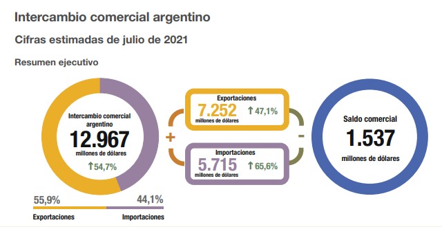 En el séptimo mes del año, la balanza comercial de la Argentina cerró con un saldo de u$s 1.537 millones. De acuerdo con los datos publicados hoy por el INDEC, las ventas al exterior fueron de u$s 7.252 millones (+47,1%), mientras que las compras a otros países se ubicaron en u$s 5.715 millones (+65,6%). Ver informe.