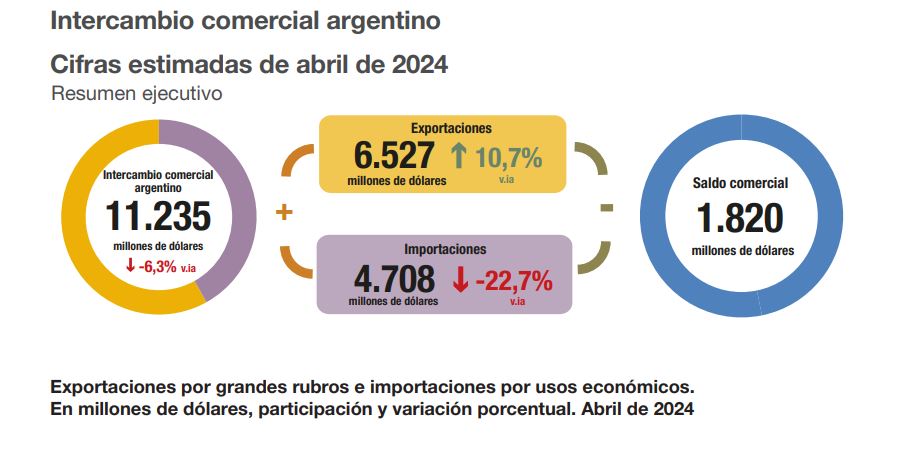 Por cuarto mes consecutivo, la balanza de intercambio internacional presentó un saldo favorable. Según el último informe publicado por el INDEC este martes, en abril, las exportaciones aumentaron 10,7% en comparación con el mismo mes del año anterior a u$s 6.527 millones. Ver informe