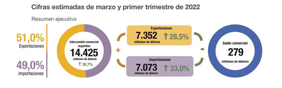 En marzo, el intercambio comercial presentó un superavit de u$s 279 millones, según cifras del INDEC. Las exportaciones ascendieron un 28,5% interanual y llegaron a los u$s 7.352 millones. En tanto, las importaciones registraron un incremento del 33,0%, por un total de u$s 7.073 millones. Ver informe.