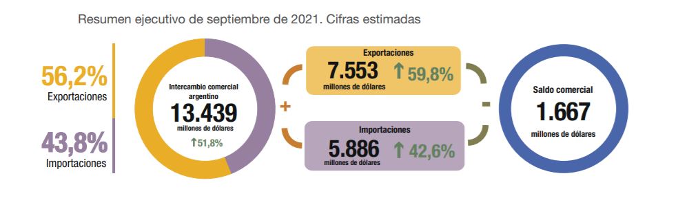 El instituto estadístico encabezado por Marco Lavagna dio a conocer las cifras del intercambio internacional argentino, que cerró el noveno mes del año con un saldo favorable de u$s 1.667 millones. Las exportaciones avanzaron un 59,8% interanual a u$s 7.553 millones, mientras que las importaciones crecieron un 42,6% a/a a u$s 5.886 millones.