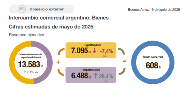 Este jueves 19 de junio se publicaron los datos correspondientes al intercambio comercial de mayo en la Argentina. Según el reporte del INDEC, se registró un superávit de u$s 608 millones. Ver informe