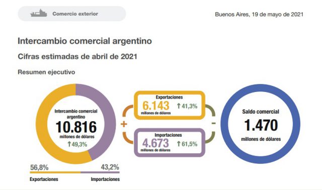 El instituto estadístico encabezado por Marco Lavagna dio a conocer las cifras del intercambio internacional argentino, que cerró el cuarto mes del año con un saldo favorable de u$s 1.470 millones. Las exportaciones crecieron un 41,3% interanual a u$s 6.143 millones, mientras que las importaciones se dispararon un 61,5% a/a a u$s 4.673 millones.