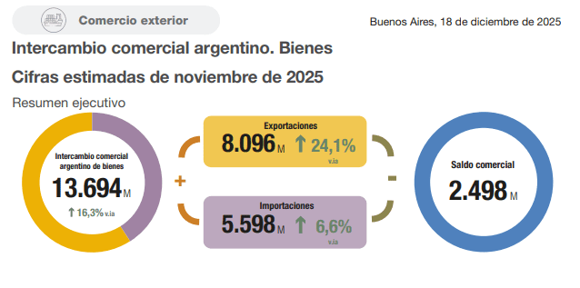 El INDEC dio a conocer los datos correspondientes al intercambio comercial de septiembre en la Argentina. Según el reporte publicado este jueves 18 de diciembre, se registró un superávit de u$s 2.498 millones. Ver Informe