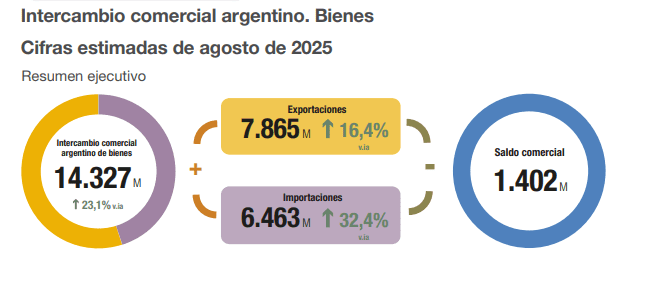 Hoy, jueves 18 de septiembre, el INDEC publicó los datos correspondientes al intercambio comercial de agosto en la Argentina. Según el reporte, se registró un superávit de u$s 1.402 millones. Ver Informe