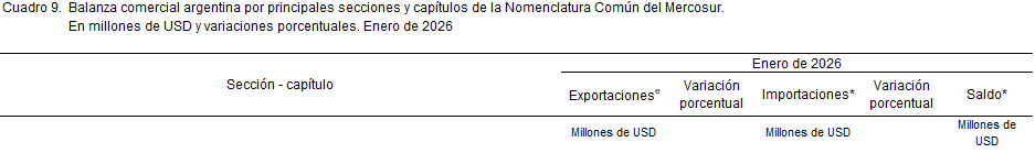 Por su parte, de acuerdo con el informe, las importaciones de enero alcanzaron un total de u$s 5.070 M, lo que representó una caída interanual del 11,9%. Esta baja se atribuyó a la disminución del 12,1% en las cantidades, mientras que los precios aumentaron 0,2%.