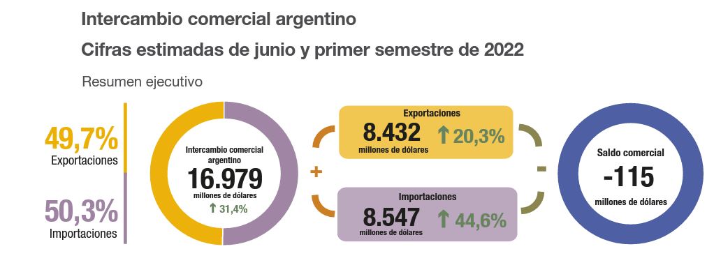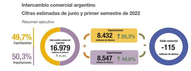 Durante el mes de junio, el intercambio comercial presentó un déficit de u$s 115 millones, según cifras del INDEC dadas a conocer este miércoles. Las exportaciones ascendieron un 20,3% interanual y llegaron a los u$s 8.432 millones. En tanto, las importaciones registraron un incremento del 44,6%, por un total de u$s 8.547 millones. Ver informe.