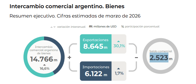 En marzo las exportaciones totalizaron los u$s 8.645 millones, lo que representó un incremento interanual de 30,1%. Este ascenso fue impulsado por un alza de 25,3% en las cantidades exportadas, y en los precios el aumento fue del 3,9%.