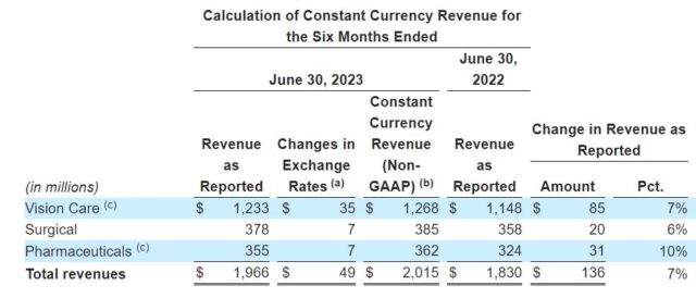 El negocio de Vision Care, el más relevante, creció un 7% interanual a u$s 1.233 millones. En tanto, su unidad de Surgical ascendió 6% a u$s 378 millones, mientras que Pharmaceuticals avanzó 10% a u$s 355 millones.