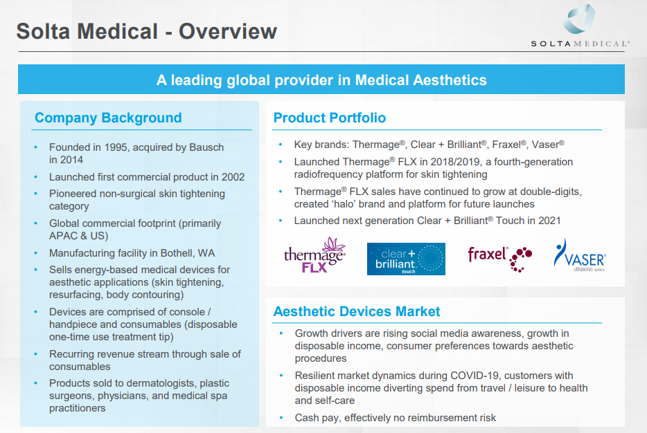 Solta fue fundada en 1995 y adquirida por Bausch en 2014. Sus principales marcas incluyen a Thermage, Clear + Brilliant y Frazel. Bausch, que tiene base en Quebec, anunció sus planes para listar la unidad a la vez que informó una pérdida neta de u$s 595 millones ($57.6 mil millones) para el segundo trimestre debido a un cargo contable. Ver Presentación.