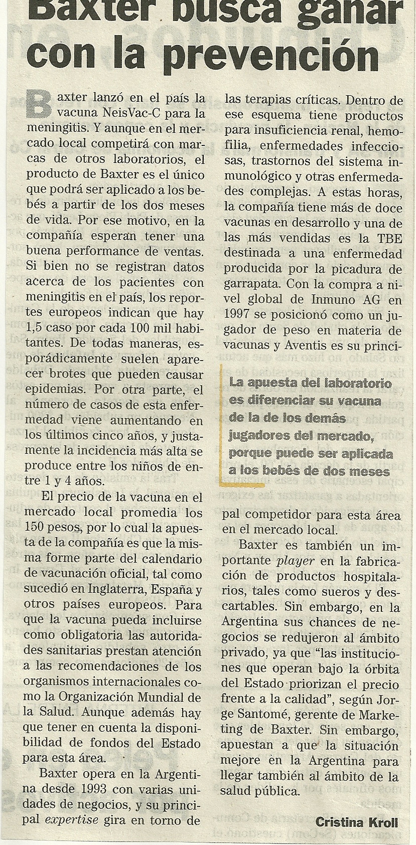 Baxter opera en la Argentina desde 1983 con varias unidades de negocios, y su principal expertise gira en torno de las terapias críticas. Dentro de ese esquema tiene productos para insuficiencia renal, hemofilia, enfermedades infecciosas, trastornos del sistema inmunológico y otras enfermedades complejas. A estas horas, la compañía tiene mas de doce vacunas en desarrollo y una de las más vendidas es la TBE destinada a una enfermedad producida por la picadura de garrapata. Con la compra a nivel global de Inmuno AG en 1997 se posicionó como un jugador de peso en materia de vacunas y Aventis es su principal competidor para esta área en el mercado local.