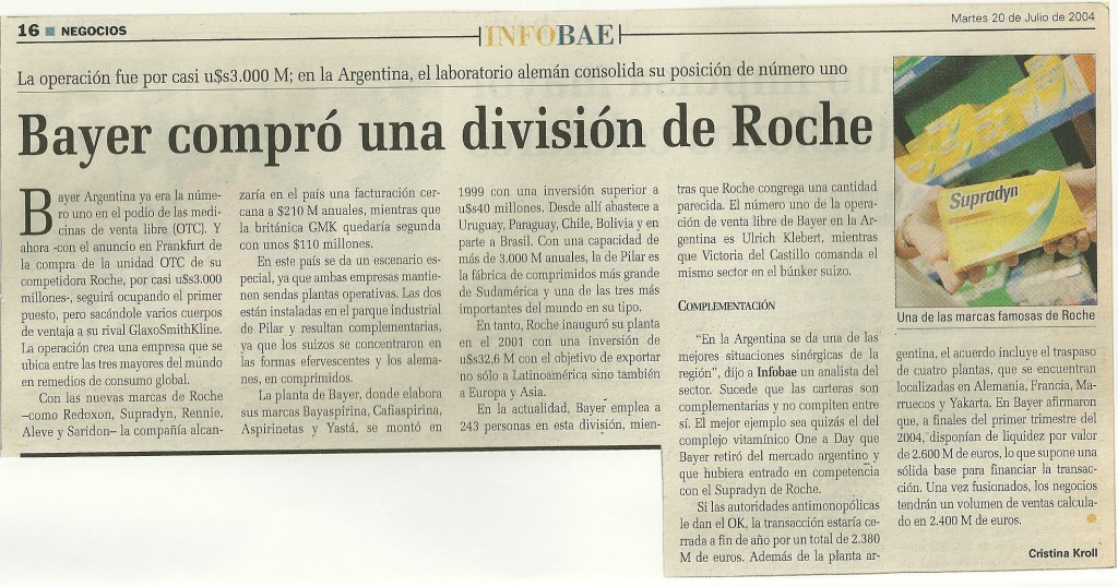 Bayer Argentina ya era la número uno en el podio de las medicinas de venta libre -OTC-. Y ahora -con el anuncio de Frankfurt de la compra de la unidad OTC de su competidora Roche, por casi u$s3.000 millones-, seguirá ocupando el primer puesto, pero sacándole varios cuerpos de ventaja a su rival GlaxoSmithKline. La operación crea una empresa que se ubica entre las tres mayores del mundo en remedios de consumo global.