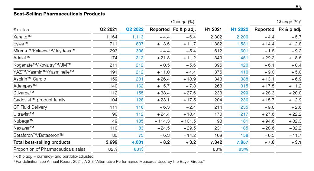 Su anticoagulante Xarelto lideró el ranking de ventas con un un aporte de € 2.200 millones y una caída interanual del -5,7%. Por debajo se ubicaron su terapia ocular Eylea, que avanzó un 12,8% a € 1.581 millones; y los anticonceptivos Mirena/Kyleena/Jaydess, cuyos ingresos marcaron una baja del -9,2% a € 601 millones.