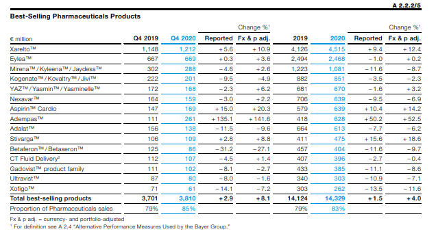 Su división de Pharmaceuticals, la segunda en importancia en términos de facturación, registró un descenso en ventas del -4.0% a €17.243 millones. Una vez más, el anticoagulante oral Xarelto encabezó el ranking de top sellers con un crecimiento del 9.4% y un aporte de € 4.515 millones. Aunque otros de sus productos estrella mostraron una performance negativa. Su terapia ocular Eylea, descendió un -1.0% a € 2.468 millones; y los anticonceptivos Mirena/Kyleena/Jaydess, se hundieron un -11.6% a € 1.081millones.