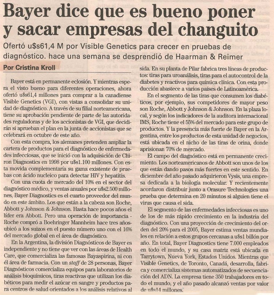 Bayer está en permanente eclosión. Y mientras espera el visto bueno para diferentes operaciones, ahora ofertó u$s61,4 millones para comprar a la canadiense Visible Genetics -VGI-, con vistas a consolidar su unidad de diagnóstico. A través de su filial norteamericana, tiene su aprobación pendiente de parte de las autoridades reguladoras de los accionistas de VGI, que decidirán si aprueban el plan en la junta de accionistas que se celebrará en octubre de este año.