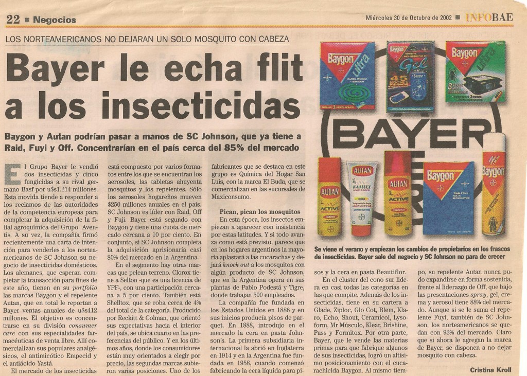 El mercado de los insecticidas está compuesto por varios formatos entre los que se encuentran los aerosoles, las tabletas ahuyenta mosquitos y los repelentes. Sólo los aerosoles hogareños mueven $250 millones anuales en el país. SC Johnson es líder con Raid, Off y Fuji. Bayer está segundo con Baygon y tiene una cuota de mercado cercana a 10 por ciento. En conjunto, si SC Johnson completa la adquisición aprisionaría casi 80% del mercado en la Argentina.