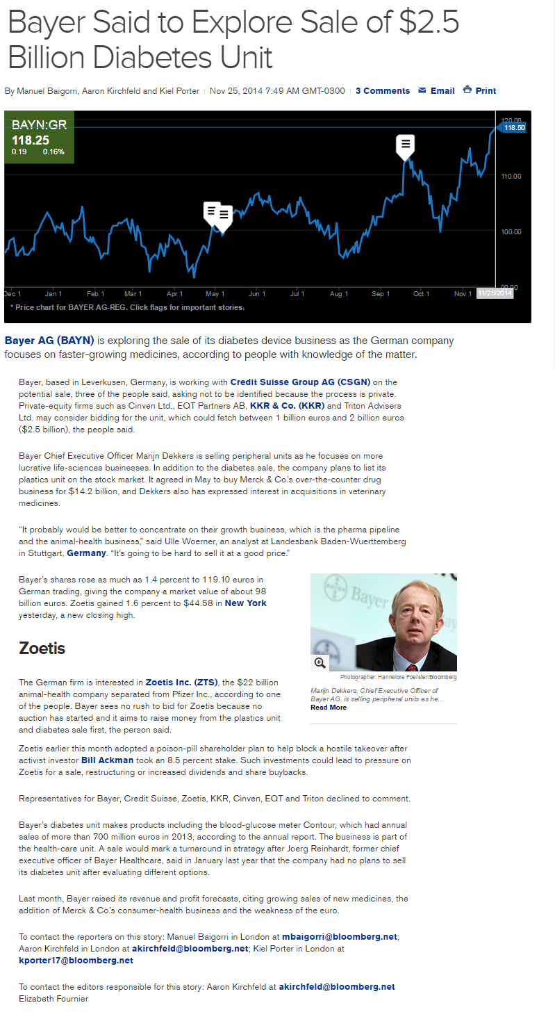 Los alemanes de Bayer está considerando la posibilidad de vender su negocio de diabetes para enfocarse en medicamentos innovadores, según anunció en exclusiva el lunes 24 de noviembre la agencia de noticias Bloomberg. Ver artículo.